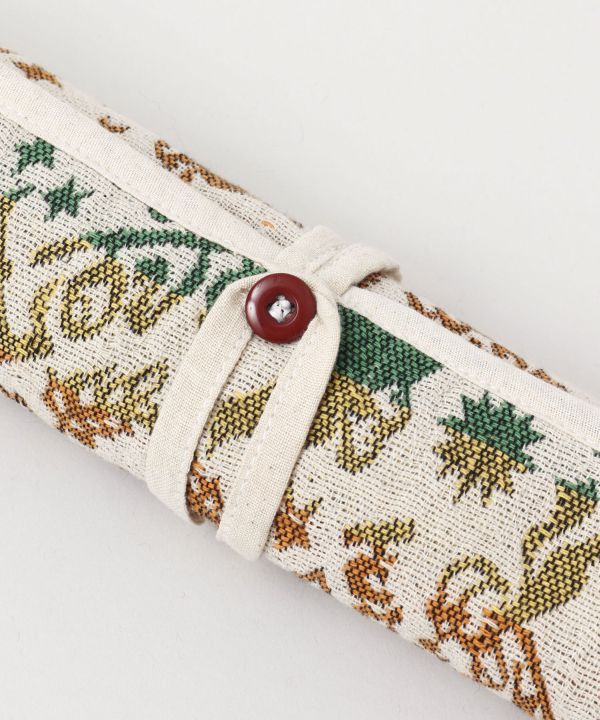 LOVE&PEACEがテーマ。綿産業を支えたガンジーや草花や山をモチーフにした。ネパールの半手織りのジャカード織りが柔らかさをかもし出す。ロングタイプのランチョンマット。キャンプや外遊びでの食事に長めのサイズでフード類をゆったり置ける。ボタンとループ付きなので丸めてループをボタンで留めることができる。