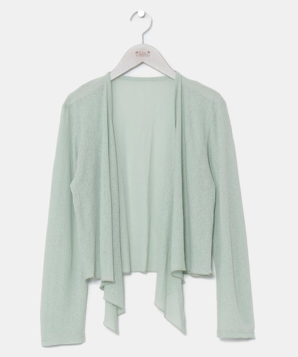 凹凸感のあるストライプの編地でさらりとした肌触りのカーディガン。しわになりにくいポリエステル素材で、風に揺れるシルエットが上品な印象を感じさせてくれます。サッシュスカートやワンピースコーデがおすすめ。持ち運びに便利な巾着付き。