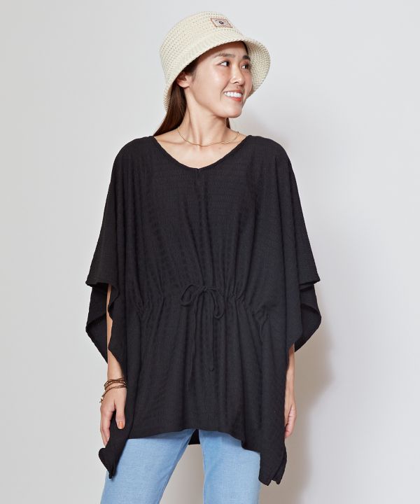 凹凸感と伸縮性のある素材で軽い着心地のポンチョトップス。海風にゆれるシルエットがよりいっそう女性らしさを引き立ててくれます。