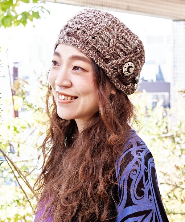 風通しの良いケーブル編みヘアバンド。天然素材と綿の素材感でナチュラルな風合いに。ボーンボタンとキノコのチャームがポイント。サイズ調節紐付き。