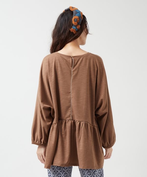 肌触りのよいスラブ素材のトップス。背中心の金色のパイピングがポイントのゆったりとしたサイズレスな一枚。