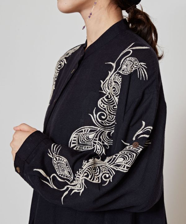 孔雀のヘナタトゥーモチーフ。胸と腕に大胆刺しゅうが施されており、変形シルエットで個性的。レーヨン麻素材でさらっとした肌触りと落ち感を楽しめるアイテム。斜めに入るボタンがエレガントな雰囲気を演出してくれ袖口にはボタンと紐が付いていて、長さの調節が可能。