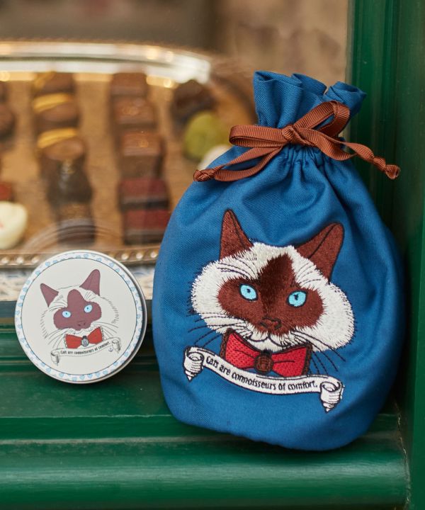 おめかししてすましたお顔の猫ちゃんがなんとも可愛らしい、巾着型ポーチ。刺しゅうされているのはヨーロッパで産まれた猫たちです。それぞれに入った英文はヨーロッパの偉人たちが綴った、猫に関わる言葉を刻んでいます。スマホやミニ財布をさっと入れて、ちょっとしたお出かけにも。マチ付きなのでたっぷり入って自立するので便利です。猫好きにはたまらないお茶目なデザインで、思わず笑顔がこぼれてしまいます。