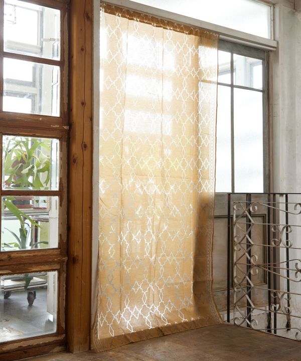 インド・ラジャスタン州タール砂漠にあるジョードプルからインスピレーションを得たオパール加工のカーテン。ジョードプルの建物は壁が青く「ブルーシティ」と呼ばれる。その魅惑的なブルーとタール砂漠の雄大なブラウンを色味で表現。柄はジョードプルのシンボルでもあるメヘラーンガル城の装飾をイメージ。重厚な世界観と抜け感のあるオパール加工が見事に合わさったデザインが魅力。長さが200cmあるので、少し大きな窓にも使用できます。