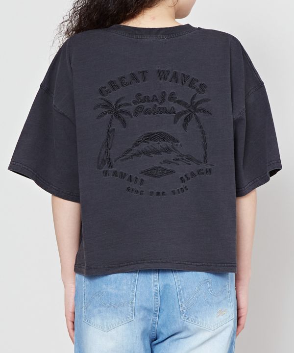 どんなコーディネートにもあわせやすいデニム風カットソーのTシャツ。ウォッシュ加工により、生地が柔らかくなっており着心地抜群。背中にはハワイの情景を感じられる刺しゅう入りです。