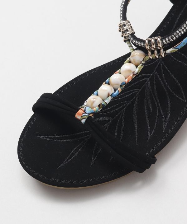 足首にキラキラと光る素材が使用された上品なデザインのサンダル。リゾートにはもちろん、シティファッションにも合わせやすく、クッション性の高い履き心地で長時間履いても疲れにくいのでおすすめです。ヒール付きなので、スタイルアップも期待できます。