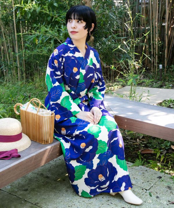鮮やかな色使いとレトロな椿の柄が可愛らしいワンピース。着物のような合わせ衿で、和の要素を取り入れました。シャリ感のある素材で、季節問わず着ていただけます。サイドにポケット付き。ウエストベルト付き。※帯は別売りです。