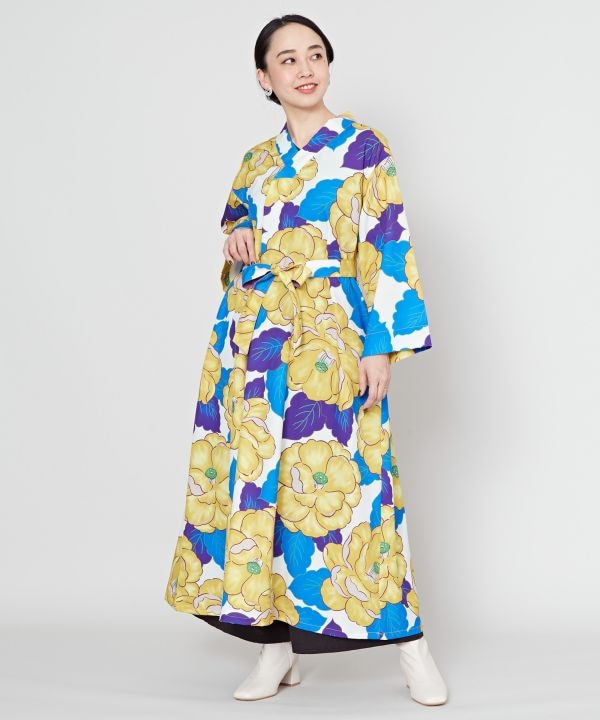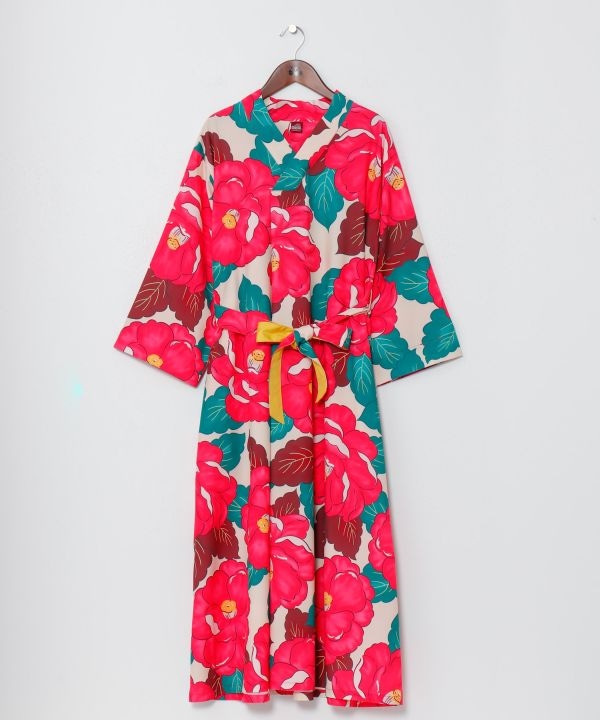 鮮やかな色使いとレトロな椿の柄が可愛らしいワンピース。着物のような合わせ衿で、和の要素を取り入れました。シャリ感のある素材で、季節問わず着ていただけます。サイドにポケット付き。ウエストベルト付き。※帯は別売りです。