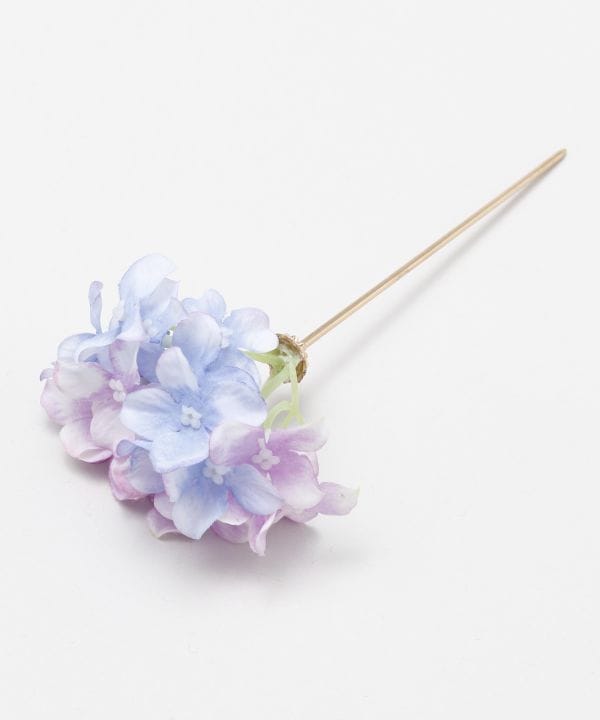 大ぶりな紫陽花の造花を使用したかんざし。スティック部分が長めの為、長い髪の毛もしっかりとまとまります。まとめ髪に挿して、ヘアアレンジのアクセントにも。木製の飾り台とガラス瓶が付属しており、かんざしを挿すと一輪挿しのように収納することが可能。ドライフラワーを挿してインテリアとしても楽しめます。専用ボックスに入っているので、贈り物にもおすすめです。※ガラス瓶に水を入れることは出来ません。