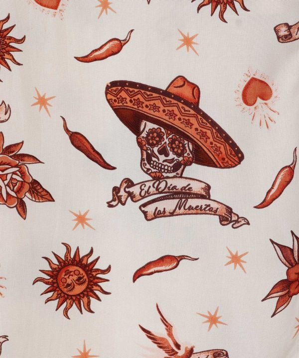 メキシコ”死者の日”のカラベラモチーフの総柄シャツワンピース。ビックシルエットでマキシ丈。落ち感あるレーヨン素材で柔らかい肌触り。メキシコの鮮やかな世界感から着想した色展開のアイテム。