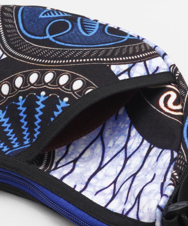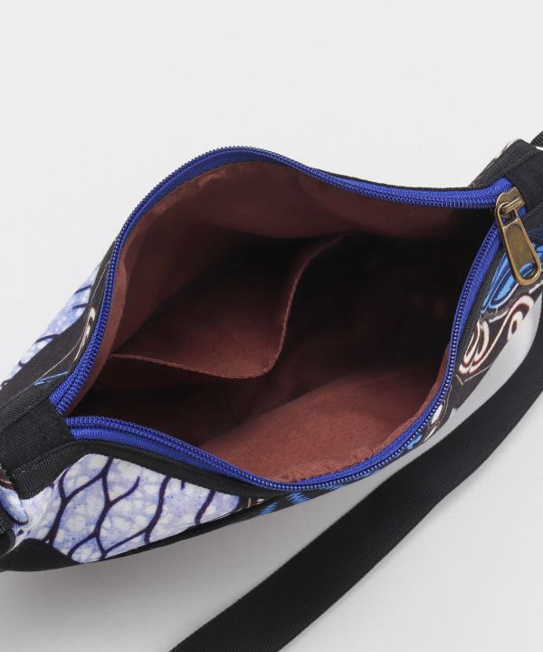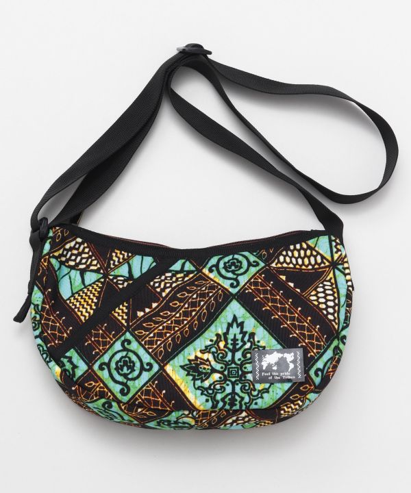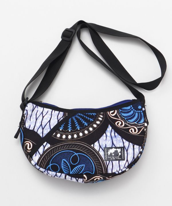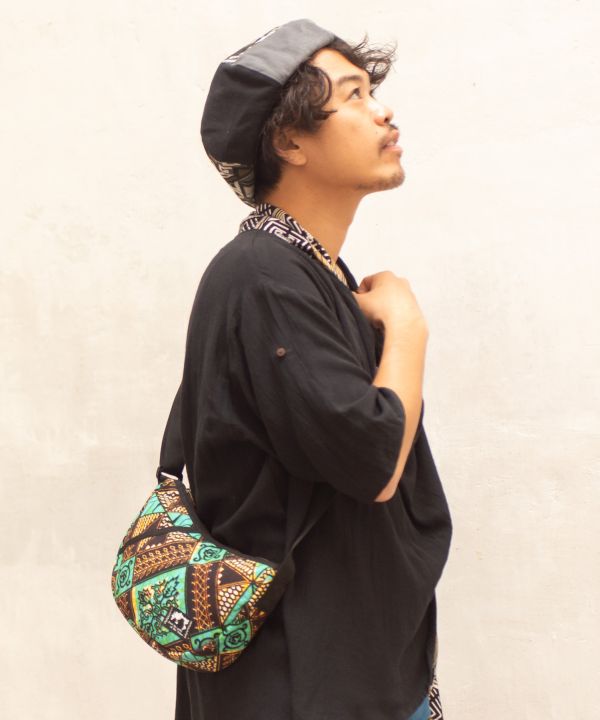 体にフィットする三日月型ショルダーバック。内側には一箇所だけポケット付きでマチがありしっかりした収納力で、フェスやちょっとしたお出かけにもおすすめ。キテンゲ柄が目を惹くこと間違いなし。