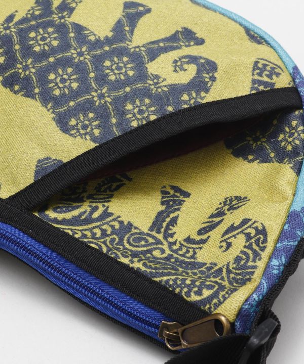 体にフィットする三日月型ショルダーバック。内側には一箇所だけポケット付きでマチがありしっかりした収納力で、フェスやちょっとしたお出かけにもおすすめ。インドのプリント技法の木版ブロックプリントの模様をイメージしたデザイン。