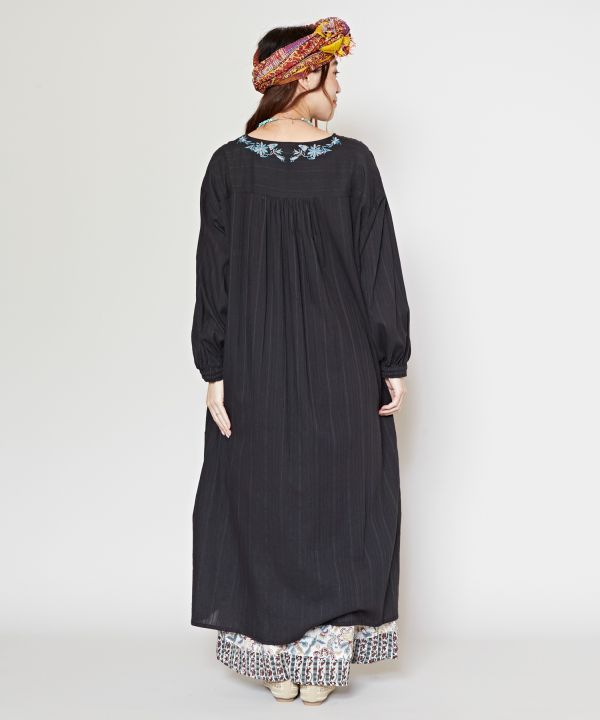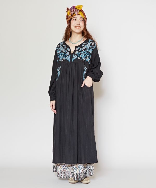 メキシコのオトミ刺繍を再現したワンピース。刺繍はオトミ定番の鳥や、昆虫、植物など、自然を感じるデザイン。メキシコの民族衣装からアレンジしたシルエット。胸元以外、サイドポケット周りと後ろ衿にもたっぷりと刺しゅうが施されている贅沢な一枚。裏地付き。