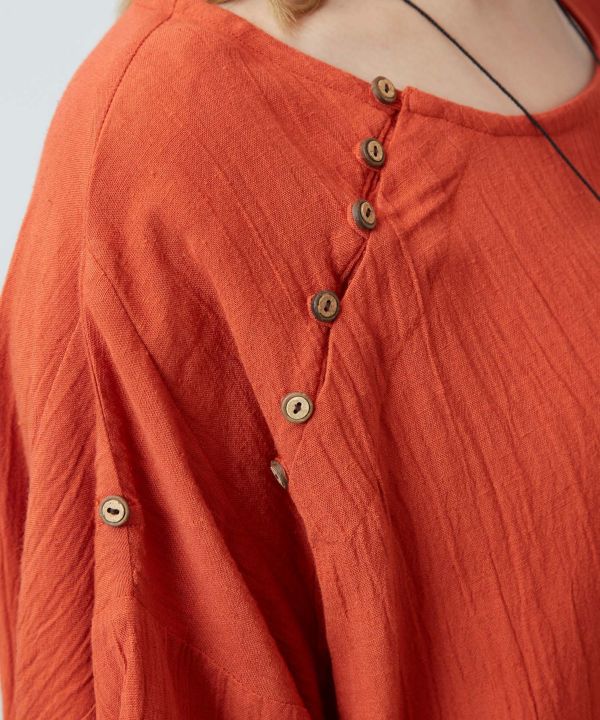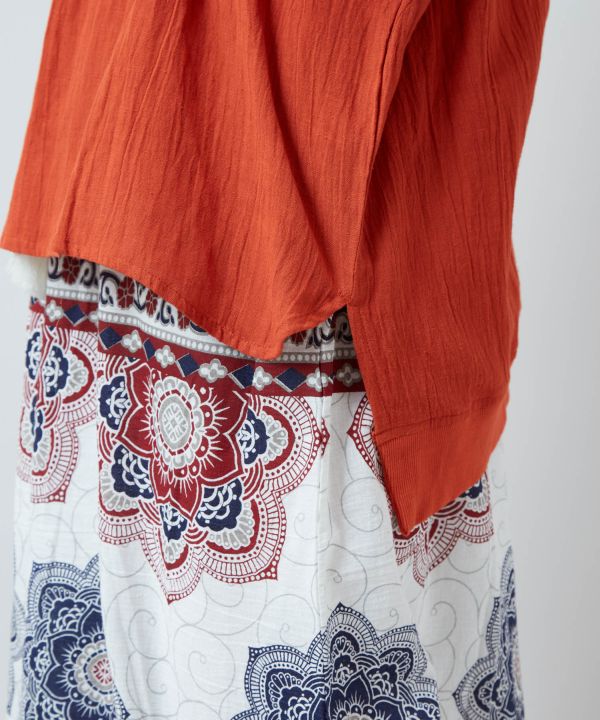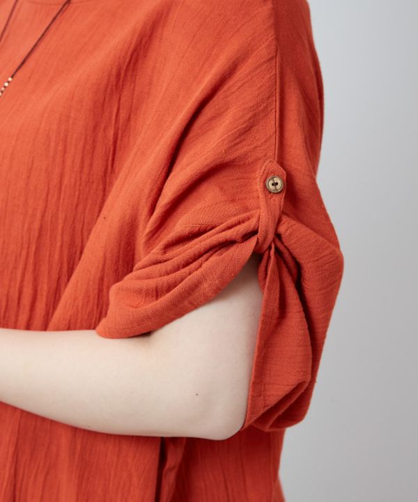 ナチュラルな麻混素材のレディーストップス。シンプルながらも刺しゅうやハイローヘム、タブ付き袖など細部までこだわったデザインが魅力。