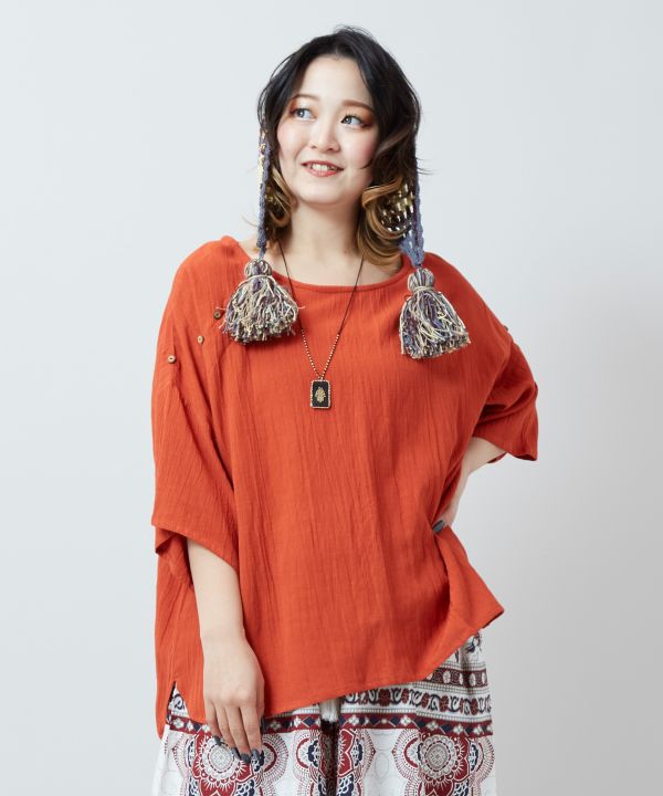 ナチュラルな麻混素材のレディーストップス。シンプルながらも刺しゅうやハイローヘム、タブ付き袖など細部までこだわったデザインが魅力。