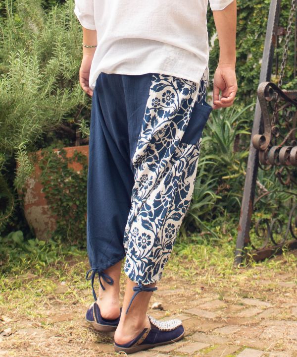 七分丈のメンズハーフパンツ。ラジャスタン州が誇る歴史的建造物、アンベール城やハワーマハルの壁画からインスパイアを受けたデザイン。裾の紐でシルエットが調整可能。コットン素材でゆったりとした着心地は暑い日のリラックスコーデに欠かせない一着。選べる4柄8色展開。
