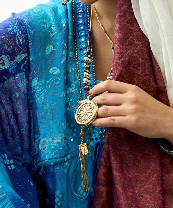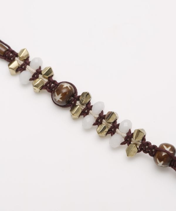 大ぶりのパーツが目を惹く、インド直輸入のネックレス。ウッドなどのビーズが編み込まれていて、紐でつけられてアジャスター付きなので長さ調節も可能。コーディネイトのワンポイントにおすすめ。