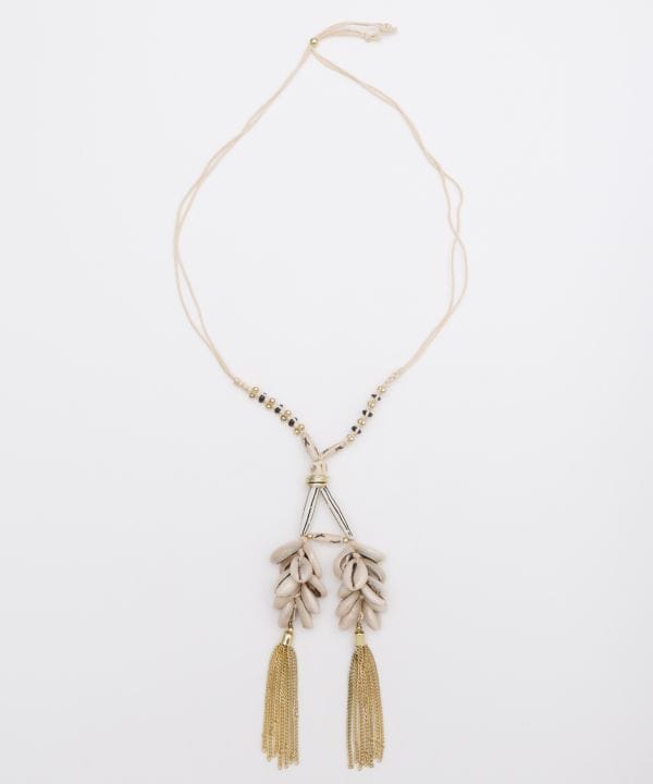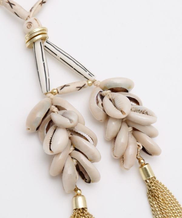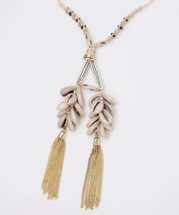 【インド直輸入】シェルとウッドビーズを使った、インド直輸入のネックレス。大ぶりなデザインで、動くたびに揺れるチャームが目を惹く一本。