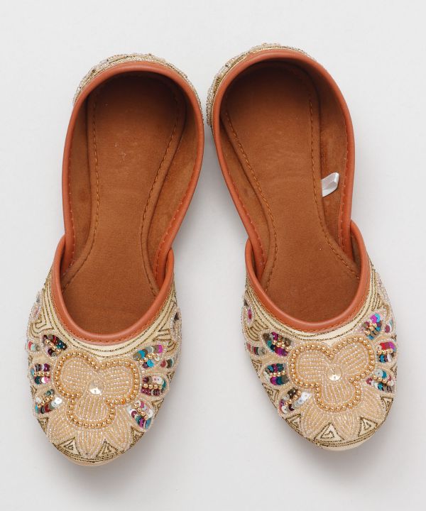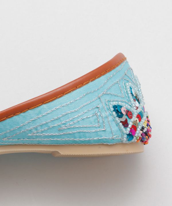 カラフルなビーズなどの刺しゅうで履きやすいジュッティ(ヒンディー語でサンダル)。夏にぴったりな、エキゾチックで華やかな足元に。