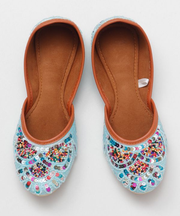 カラフルなビーズなどの刺しゅうで履きやすいジュッティ(ヒンディー語でサンダル)。夏にぴったりな、エキゾチックで華やかな足元に。