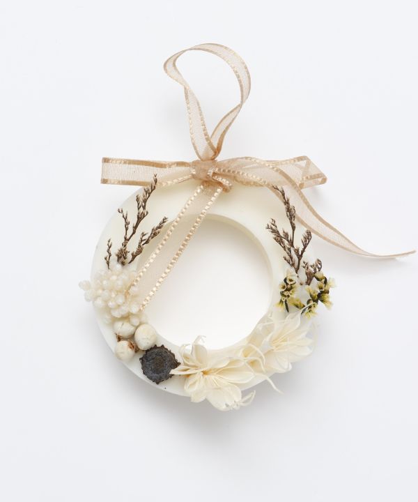 リースのような型が可愛らしいドライフラワー入りサシェ。お部屋に飾るのはもちろん、プレゼントとしてもおすすめです。優しいフローラルの香り。ふわりと匂っていつもの日常がちょっとだけ素敵に。