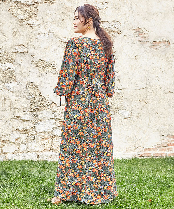 花々が咲き誇る美しいフランスの庭をイメージしたプリントワンピース。ボリュームのある袖に大胆に入ったスリットが印象的。胸元のタックと背中に入ったゴムで胸下が程よくフィットして綺麗なAラインに。ストンと落ち感のあるすっきりとしたシルエットながら生地が柔らかく、リラックス出来る軽やかな着心地です。サイドにポケットもあり。裾のスリットのおかげで動きやすく、袖とウエストのリボンづかいが女性らしいスタイルに仕上がります。マキシ丈なのでコーディネートなしで一枚でお洒落にご着用が可能です。