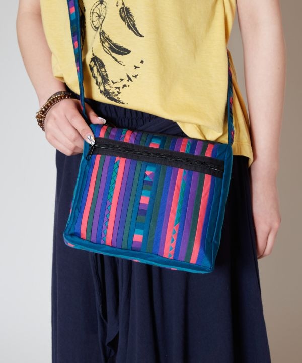 【タイ直輸入】華やかさでカラフルなリス族のファブリックを使ったバッグ。リス族のファブリックは、ストライプや三角形が重なった、カラフルな幾何学模様が特徴です。スマホや財布、ポーチが入るサイズ感で、マチも付いているので普段使いもしやすいです。コーデを一気に明るくしてくれるバッグです。