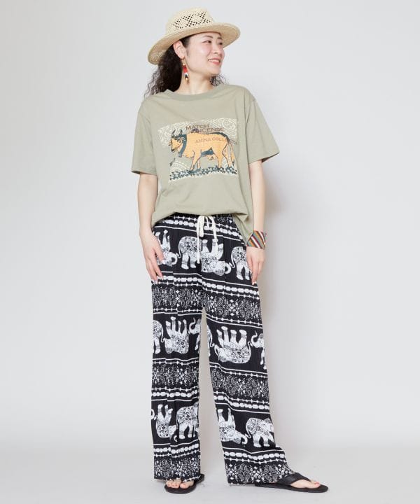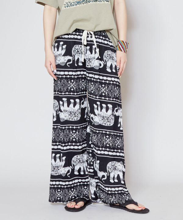 【タイ直輸入】象が全体的にプリントされた印象的なパンツ。ウエストには紐があり調整が可能。シルエットもスラッとしてみえます。