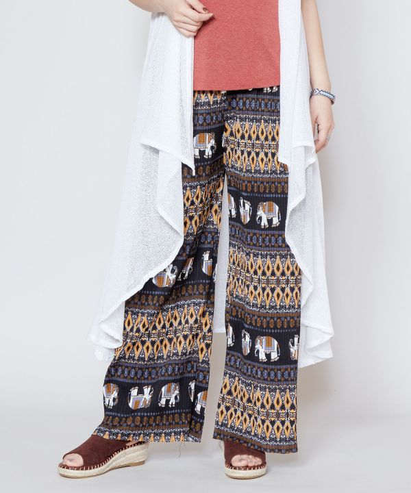 【タイ直輸入】象が全体的にプリントされた印象的なパンツ。ウエストには紐があり調整が可能。シルエットもスラッとしてみえます。