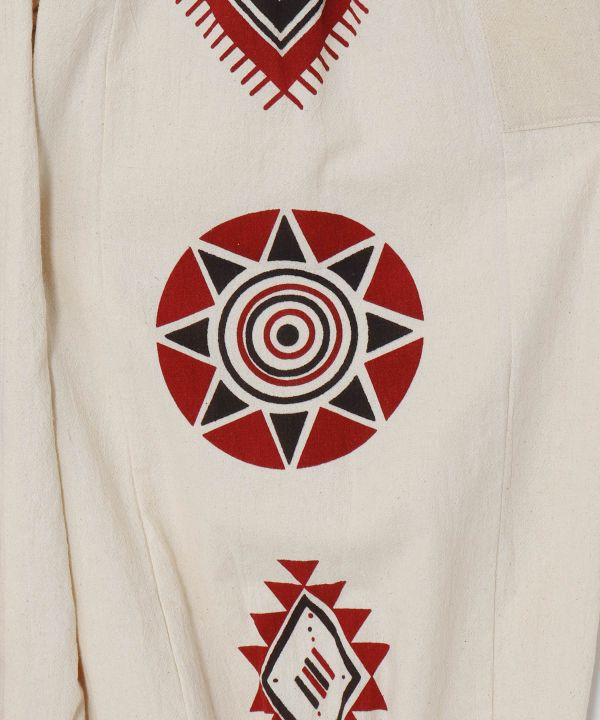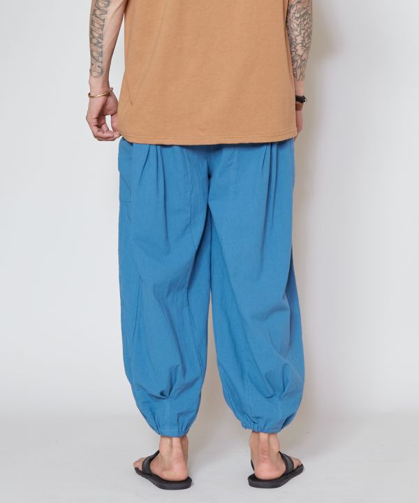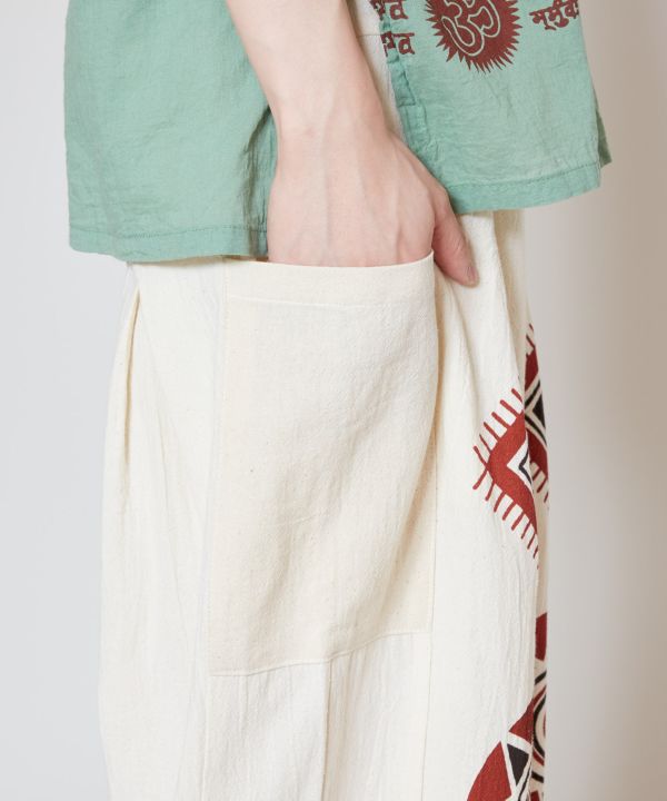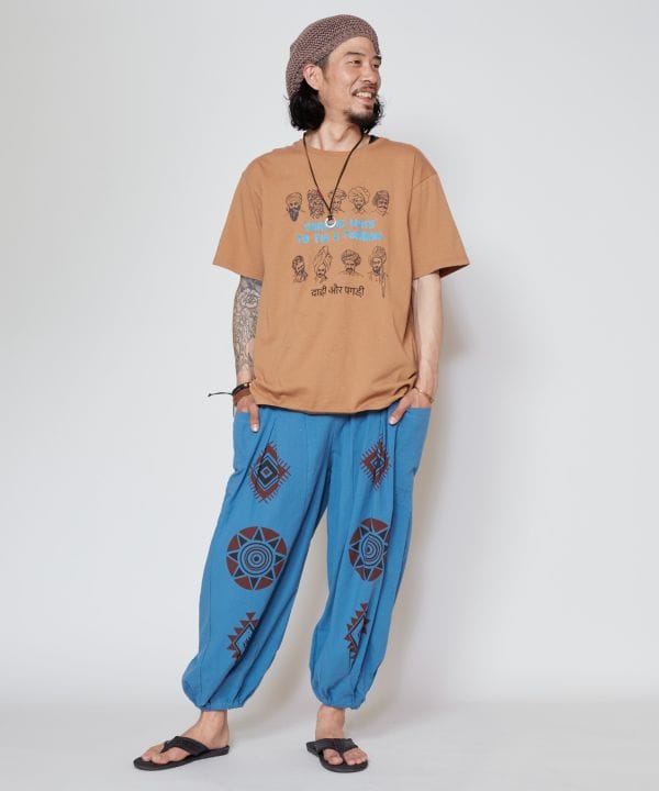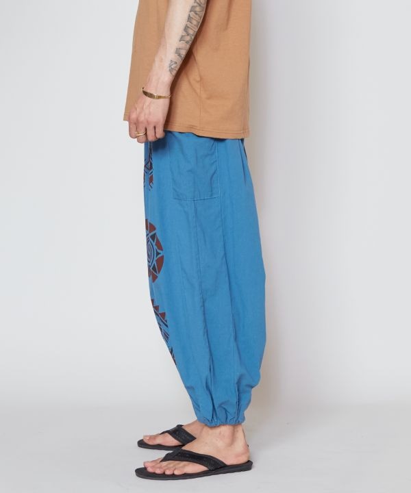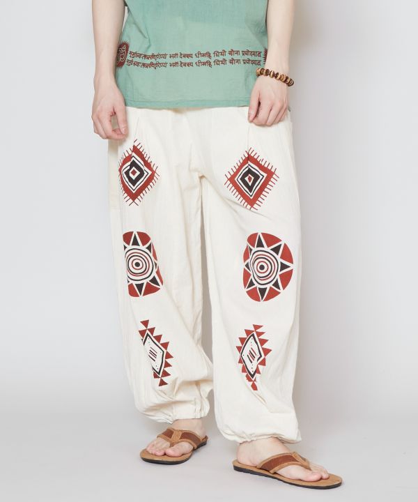 【タイ直輸入】前面にネイティブな柄があり、柔らかな素材が特徴的なメンズパンツ。ウエストには調整できる紐あり。サイドには深めなポッケト。裾にもゴムがありシルエットも変えながら楽しめる。