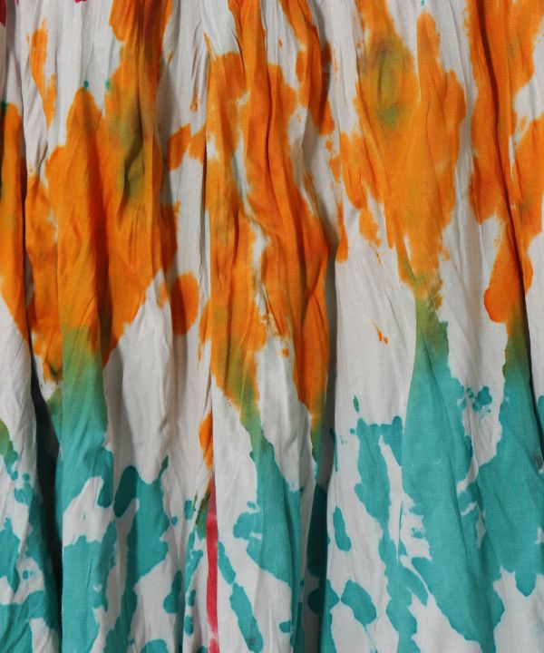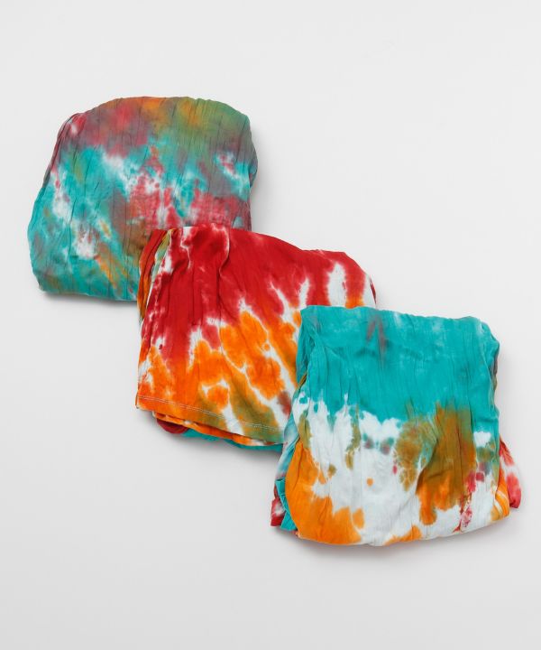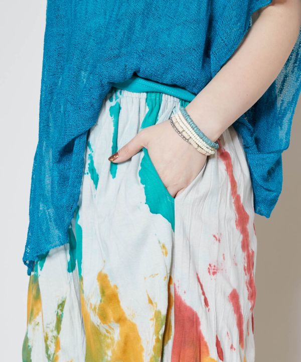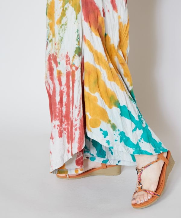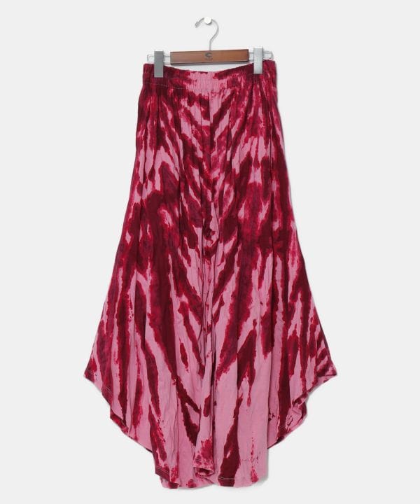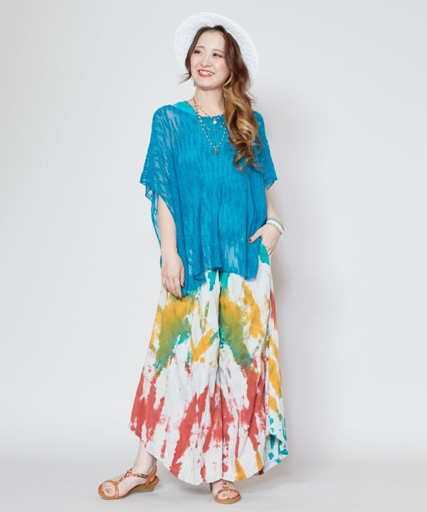 【タイ直輸入】タイダイが映えるワイドパンツ。ウエストはゴムになっており、ゆったり着られます。両サイドにポケットつき、ボリュームたっぷりなワイドパンツ。※タイダイ染めの特性上、色味や柄の出方がひとつひとつ異なります。