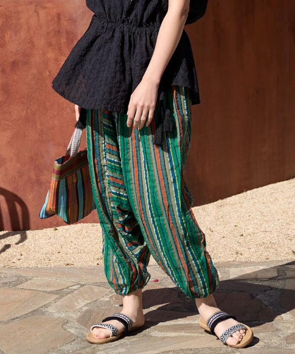 【タイ直輸入】ストライプ柄が縦と横に入り混じる斬新さに目を惹かれるパンツ。肌さわりの良いコットン100%素材。※こちらはアソート商品のため、写真は一例となります。