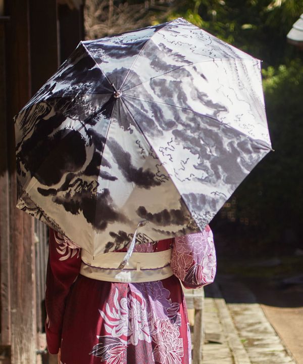 夏の土用の時期に打ち寄せる土用波。波模様を大胆に表現した日傘。バンブー素材の持ち手が粋な印象。性別問わずお使いいただけます。晴雨兼用。遮光率90%以上。