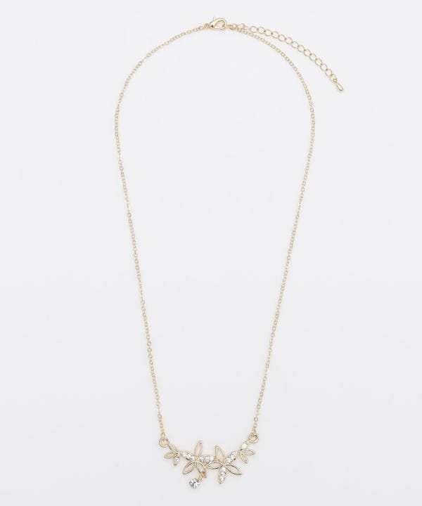 首元を華やかに演出する、プルメリアモチーフのネックレス。キラキラ光るラインストーンはドレスとの相性も抜群です。