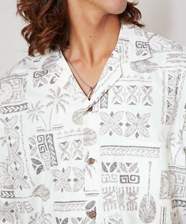 【ハワイ直輸入】タパ柄のメンズアロハシャツ。昔ながらのアロハシャツのタパ柄は、爽快な着心地とレトロなデザインがポイント。素材は綿100%と肌触りの良さも抜群。