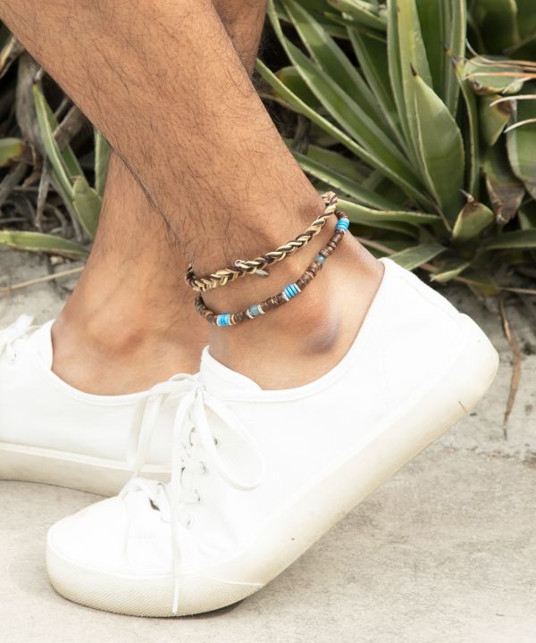 太めに編み上げたコードと大ぶりビーズが印象的なアンクレット。ボード型チャームに刻まれたsurfの文字が、サーフカルチャーの雰囲気を高めます。存在感のあるデザインで足元のアクセントに。