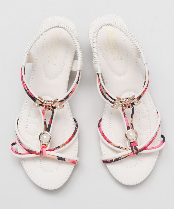 イタリア製のスカーフを使ったストラップがおしゃれなサンダル。バックストラップがゴム仕様で程よく足にフィット。高すぎないウェッジヒールと、クッションが効いたふかふかのインソールで履き心地が良く疲れにくいのがポイントです。メタルパーツで美しく飾られ、華やかな印象。