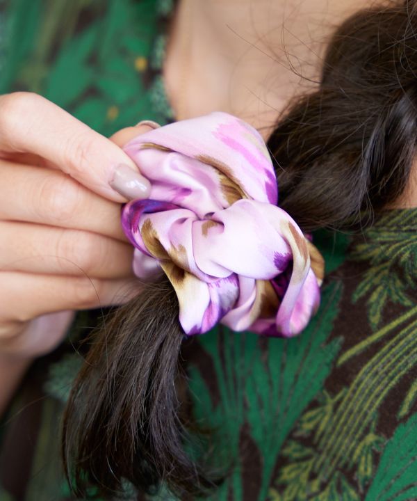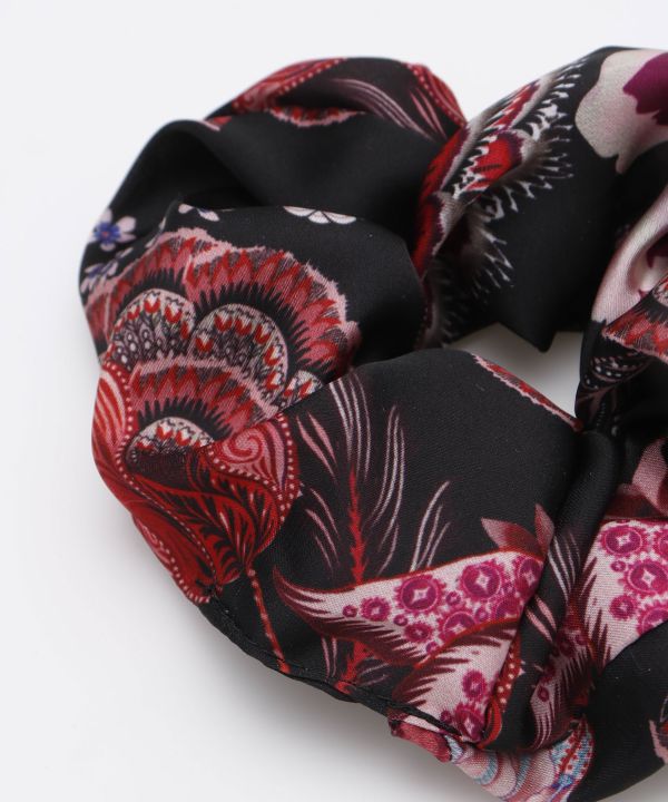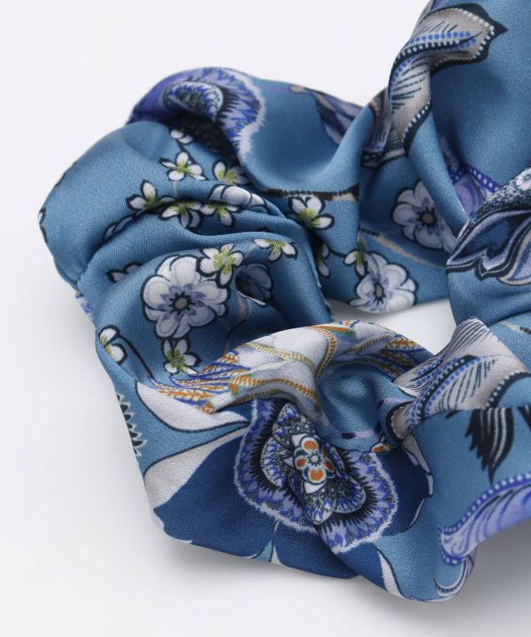 さらっとなめらかな生地感のイタリア製スカーフで作られたシュシュ。腕に着けてもかわいく、手首を締め付けないサイズ感。落ち着いた色味でどんなファッションにも取れ入れやすい花柄です。