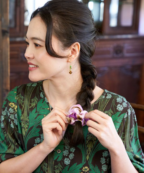 さらっとなめらかな生地感のイタリア製スカーフで作られたシュシュ。腕に着けてもかわいく、手首を締め付けないサイズ感。落ち着いた色味でどんなファッションにも取れ入れやすい花柄です。