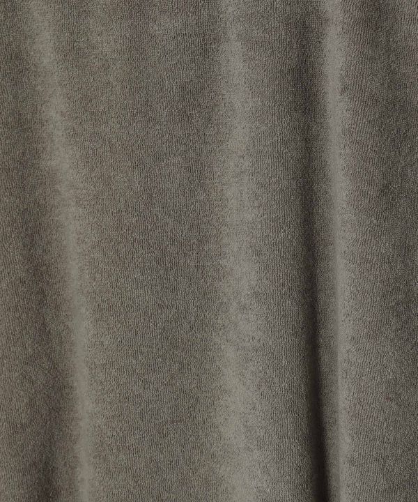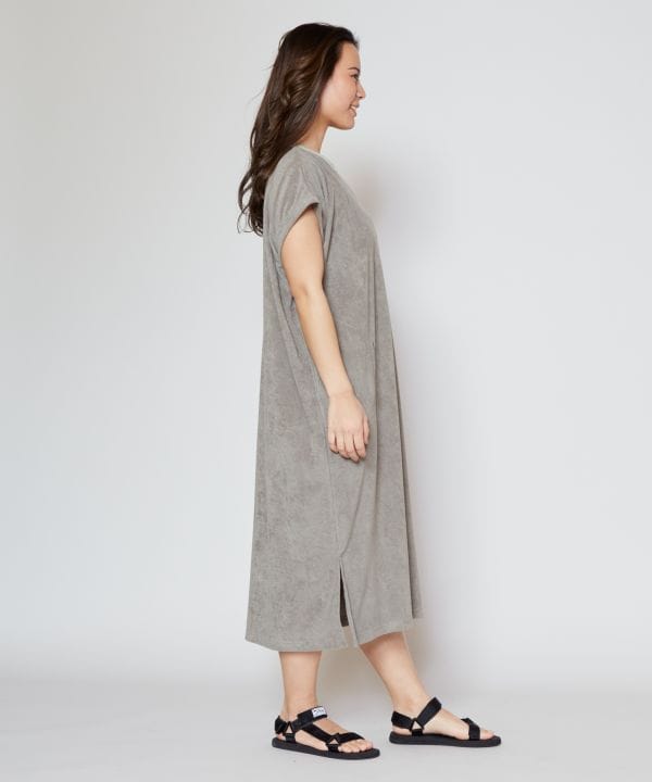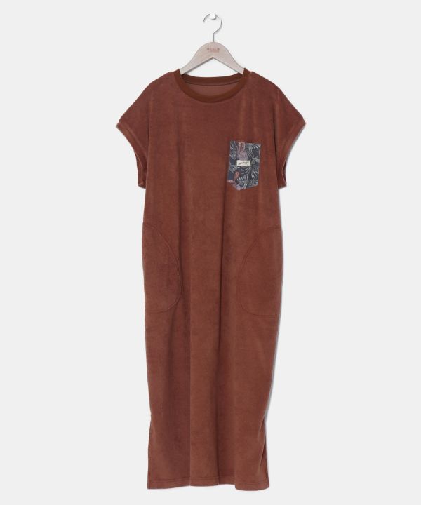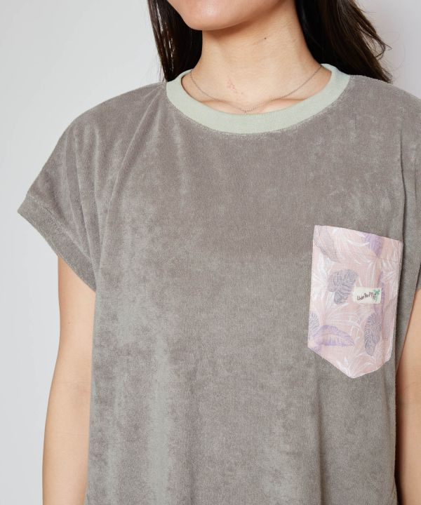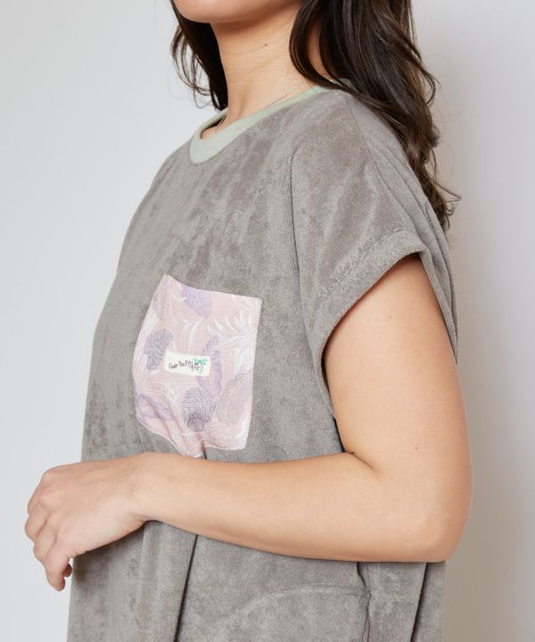 ふわっとした弾力と柔らかい肌触りが心地よい、綿ポリエステルのパイル素材を使用したフレンチスリーブのワンピース。吸水性が高いので、汗をかいても気持ちよく着られます。胸には柔らかな色合いで表現されたボタニカル柄のポケット。