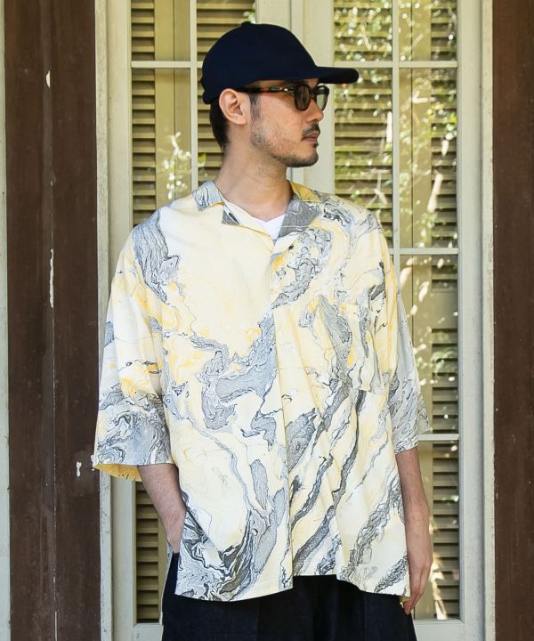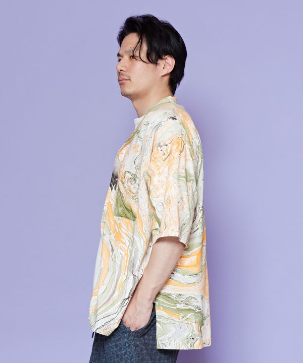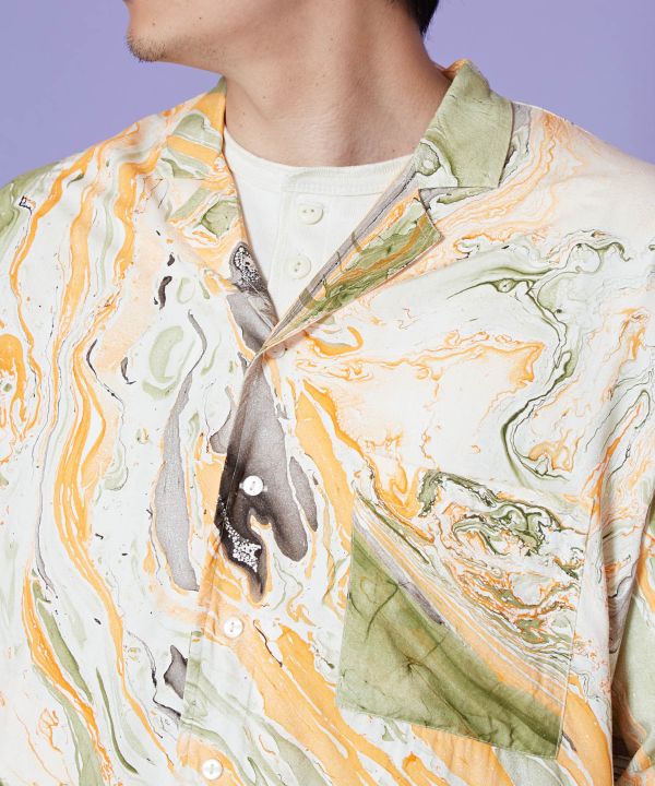墨流し染めの技法に色彩を加えた柄の開襟シャツ。さらりとした着心地のレーヨン素材で、暑い日も涼やかに過ごせます。染技法の由来は平安時代、水の上に墨を浮かべた後、模様を和紙で写し取った「墨流し絵」という絵が発祥だといわれています。ユニセックスで着用可能。※商品一点ずつ柄の出方が異なります。