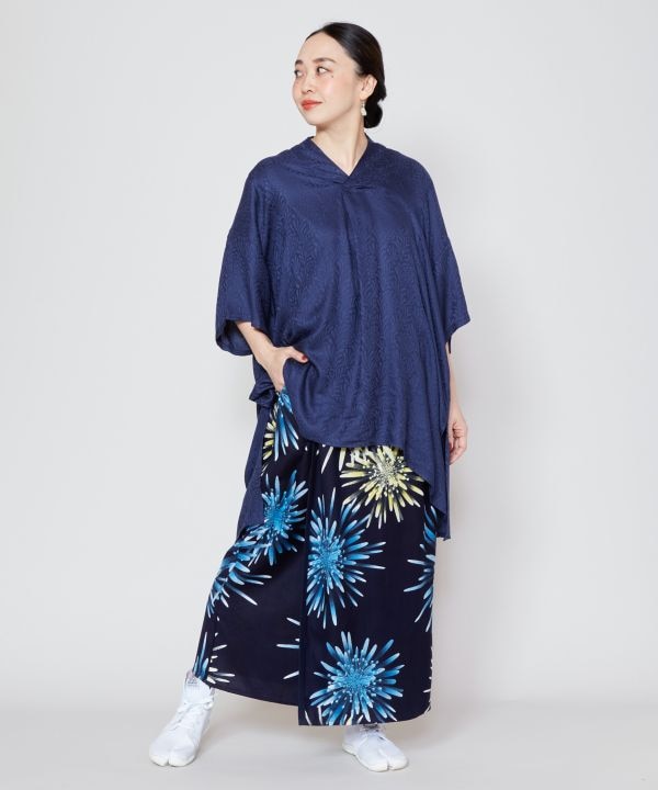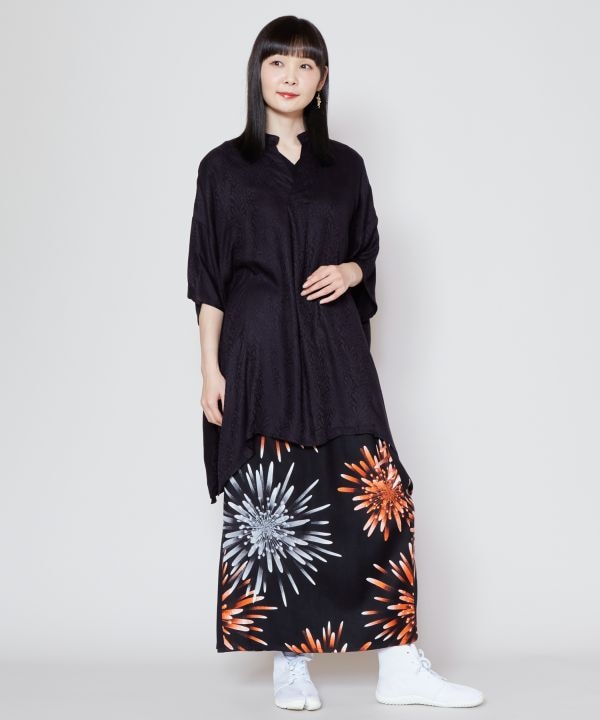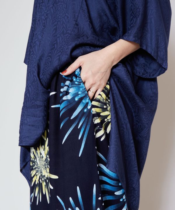 艶やかな美しい色合いと大輪の花火柄スカート。着物のようなシルエットで、涼しく柔らかな風合いのレーヨン素材。残していきたい日本の風物詩から倣い(ならい)、現代に落とし込んだ夏の装い。浴衣や着物の代わりに、お祭りやイベントにおすすめです。サイドポケット付き。