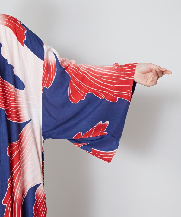 優雅にたゆたう金魚を大胆にあしらったデザインが目を惹く、長丈の着物羽織。着物に倣(なら)い、日常的に和を身に纏える。華やかな和装カジュアルスタイルに。柔らかなレーヨン素材で、さらりとした着心地。サイドポケット付き。UVカット加工が施されているので、強い日差しでも安心です。