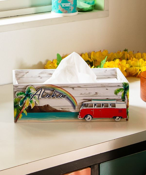 箱型のティッシュケース。ハワイの風景が描かれており、1つ置いておくだけでお部屋の雰囲気が華やかに。蓋が沈むので中身のペーパーが減っても取りやすく、ボックスタイプ・ソフトパックタイプのどちらでも使えます。