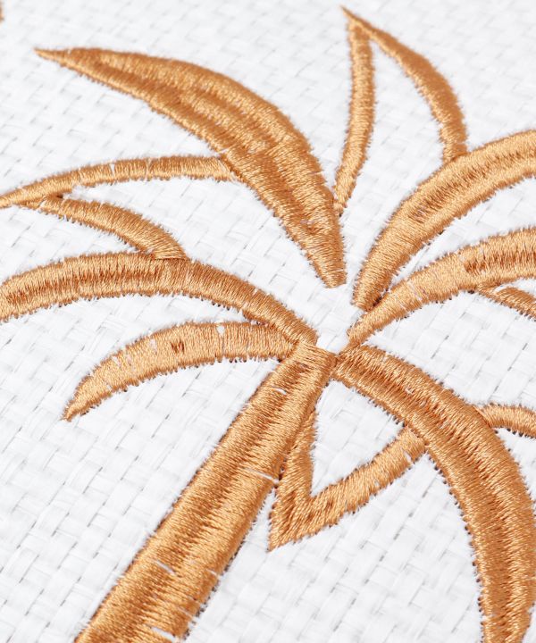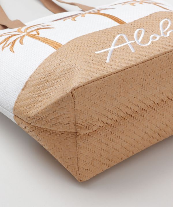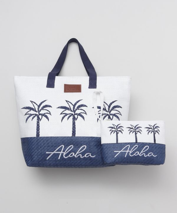 大容量のトートバッグとポーチのセット。大きなパームツリーの刺しゅうがポイント。ショッピングなどの普段使いはもちろん、ビーチへのお出かけにもぴったりです。