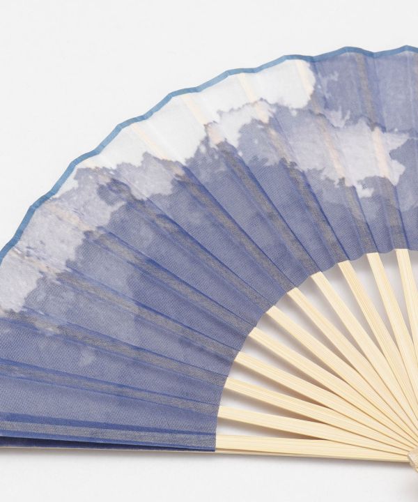 色がにじんで広がる、色の遊びが入った竹扇子。透け感のある生地が涼しげ。持ち運びに便利な専用袋付き。オリジナルの刻印入り。