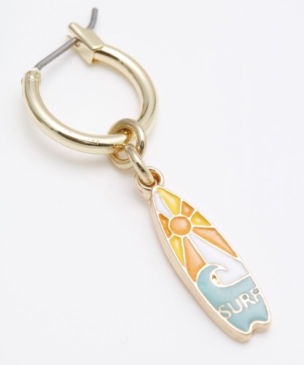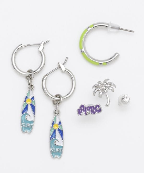 ハワイの波や太陽を感じさせる柄が描かれた、サーフボード型の6点セットピアス。alohaの文字やパームツリーのモチーフが、あなたをハワイ気分にいざないます。その日の気分やコーディネートで自由な組み合わせを楽しめます。