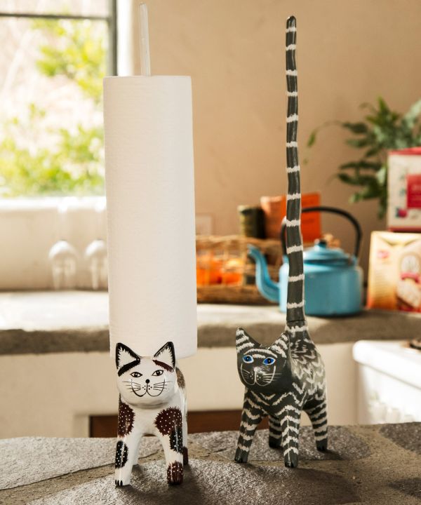 バリの伝統民芸、木彫のネコのハンドペイントトイレットペーパーホルダー。しっぽ部分にトイレットペーパーを2個差し込むことができます。