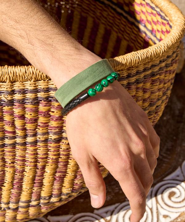 レザー調で高級感あふれるデザインが魅力の天然石ブレスレット。マグネットなので着脱がしやすく、様々なコーディネイトのワンポイントとして大活躍間違いなしです。
