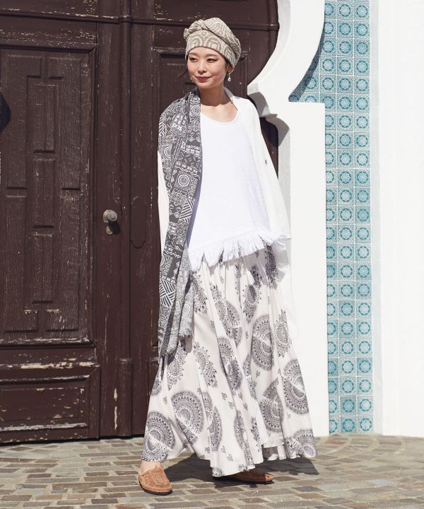 【Amina×VORRUK】タイのアーティストVORRUKとのコラボ。ロータスなどの植物を描いた絵を、単色の総柄に落とし込んだデザインの変形スカート。柔らかくて涼しいレーヨン素材で着心地抜群。たっぷりしたドレープは動くたびに魅力を引き出してくれます。